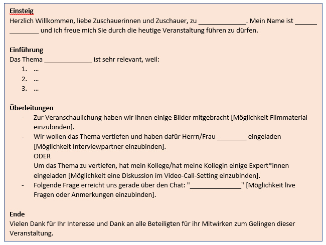 - Soll die Veranstaltung/die Aufnahme etwas vorstellen, muss der Moderator oder die Moderatorin eventuell auf weitere Informationsmöglichkeiten hinweisen, kann aber nicht